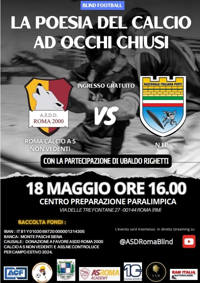 Una manifestazione sportivo-culturale che vedrà impegnate la ASD Roma 2000, Roma Calcio a 5 non vedenti e la Nazionale Italiana Poeti in una partita di calcetto con raccolta fondi a favore della Roma Calcio non vedenti. Ospite d'eccezione Ubaldo Righetti e ingresso gratuito.
